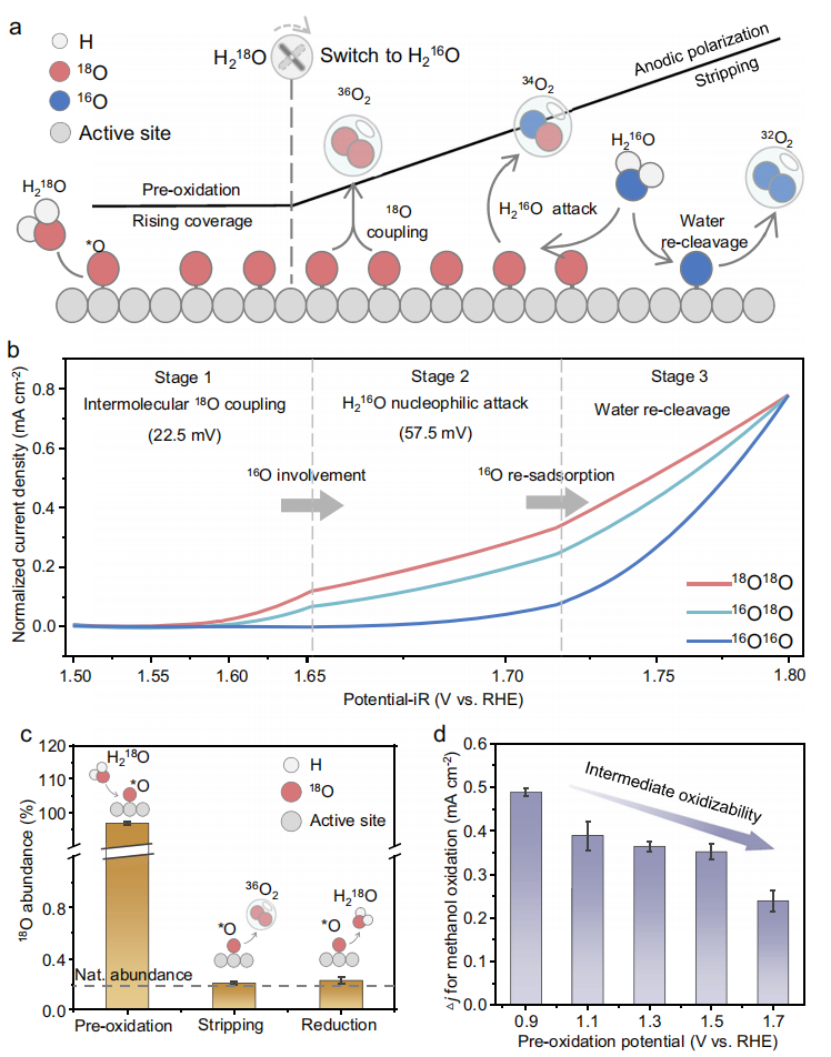 利用類溶出伏安法產(chǎn)生不同的氧氣同位素分餾實(shí)現(xiàn)對*O轉(zhuǎn)化過程的追蹤。在H218O中對電極界面進(jìn)行預(yù)氧化實(shí)現(xiàn)*O的同位素標(biāo)記,隨后將電解液組分迅速切換為H216O,并進(jìn)行陽極極化(圖2a)。在極化過程中,不同質(zhì)荷比的O2具有不同的起始電位,18O18O、16O18O和16O16O依次析出(圖2b)。首先,預(yù)氧化的18O發(fā)生分子間偶聯(lián)形成36O2。隨后被H216O親核攻擊,產(chǎn)生34O2。最終,水的再裂解和額外的電子轉(zhuǎn)移使32O2在更高的過電位下產(chǎn)生。通過對類溶出伏安不同階段的電解液進(jìn)行穩(wěn)定同位素分析,確定O2中的18O來源于界面氧(圖2c)。此外,預(yù)氧化后的甲醇氧化實(shí)驗(yàn)證明了界面氧物種的生成(圖2d)。