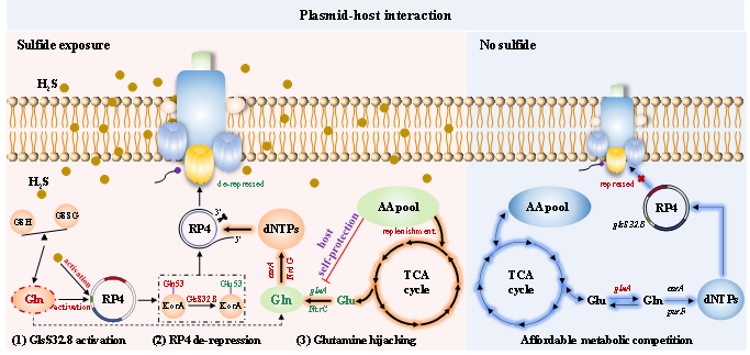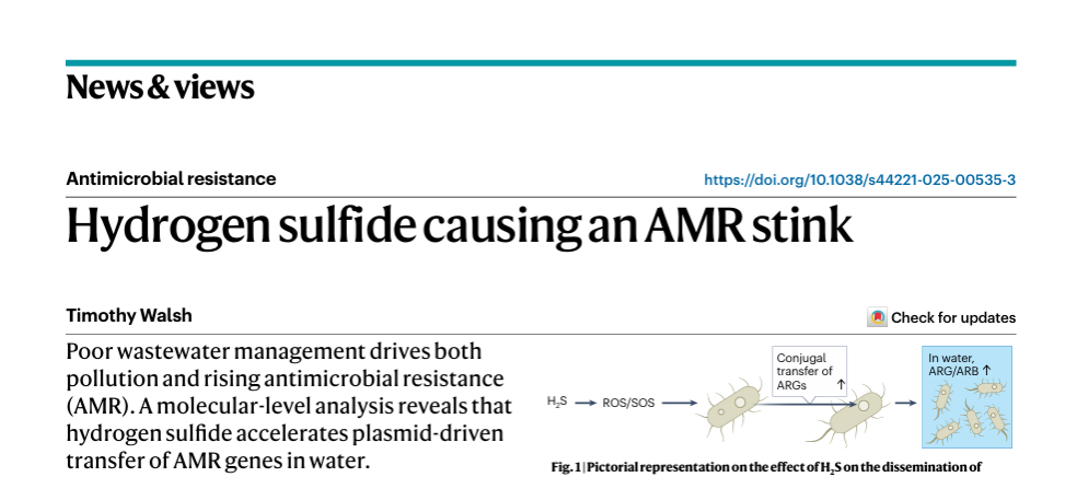 抗生素抗性基因(ARGs)通過水平基因轉(zhuǎn)移進(jìn)行傳播,對(duì)全球健康構(gòu)成重大威脅。盡管已知外源脅迫因素會(huì)促進(jìn)接合轉(zhuǎn)移,但內(nèi)源微生物代謝物在此過程中的作用尚不明確。本研究發(fā)現(xiàn)在廢水中普遍存在的代謝物硫化氫(H2S)是一種強(qiáng)效但被忽視的質(zhì)粒接合促進(jìn)因子,闡明了一種不同于經(jīng)典SOS反應(yīng)的質(zhì)粒自主激活機(jī)制(圖1)——RP4質(zhì)粒利用其編碼蛋白Upf32.8(重命名為GlsS32.8)感知細(xì)胞內(nèi)谷氨酰胺水平,觸發(fā)質(zhì)粒去抑制,并增強(qiáng)從宿主竊取以谷氨酰胺為核心的代謝過程,從而在H2S環(huán)境下促進(jìn)接合轉(zhuǎn)移。該研究重新定義了微生物代謝物作為抗性傳播關(guān)鍵驅(qū)動(dòng)者的角色,并為理解質(zhì)粒-宿主相互作用以遏制ARGs擴(kuò)散提供了重要見解。歐洲科學(xué)院院士、牛津大學(xué)Timothy Walsh教授在Nature Water撰寫題為“Hydrogen sulfide causing an AMR stink”評(píng)論(圖2)。論文第一作者為黃海寧助理教授,通訊作者為陳銀廣教授和郭建華教授(昆士蘭大學(xué))。