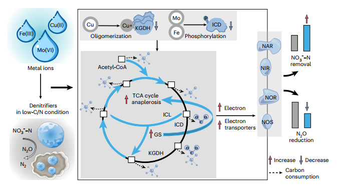 針對(duì)低碳氮比(C/N)污(廢)水生物脫氮依賴外碳源同時(shí)排放大量溫室氣體的問題,創(chuàng)新提出一種代謝重編程策略(圖3),通過引導(dǎo)碳通量進(jìn)入乙醛酸分流(GS)途徑,強(qiáng)化三羧酸循環(huán)回補(bǔ)反應(yīng),實(shí)現(xiàn)低C/N廢水高效脫氮并減少溫室氣體排放,其中總氮去除率提升196.2%、氧化亞氮排放減少51.3%。該效應(yīng)源于異檸檬酸脫氫酶和α-酮戊二酸脫氫酶被抑制,導(dǎo)致異檸檬酸積累從而激活乙醛酸分流關(guān)鍵酶異檸檬酸裂解酶,優(yōu)先啟動(dòng)GS驅(qū)動(dòng)的回補(bǔ)代謝。這種碳代謝重編程策略可降低脫氮有機(jī)碳需求,提升碳源利用效率。論文第一作者為博士研究生彭浩進(jìn),通訊作者為陳銀廣教授。