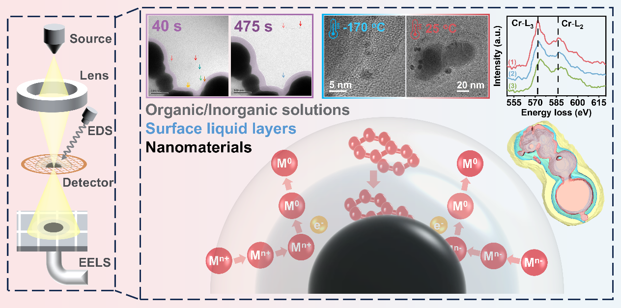 凌嵐教授團隊以納米鐵顆粒與氯金酸溶液反應(yīng)體系作為研究模型,構(gòu)建了一種集原位液相電子顯微鏡(LP-TEM)、冷凍電子顯微鏡(Cryo-TEM)、電子斷層掃描(ET)及電子能量損失譜(EELS)和X射線能譜(XEDS)于一體的多模態(tài)高分辨率電子顯微鏡平臺。為了在常溫下保留并解析界面液層結(jié)構(gòu),團隊創(chuàng)新提出了一種冷凍干燥制樣策略,實現(xiàn)常溫下液層三維重構(gòu)與化學(xué)分析,有效彌補了單一技術(shù)的局限。研究直觀揭示了溶液中納米鐵顆粒周圍存在一層動態(tài)變化的表面液層,其厚度、結(jié)構(gòu)與離子分布隨界面電荷變化而動態(tài)變化。通過高時空分辨成像與譜學(xué)分析,團隊在液層內(nèi)觀察到明顯的物質(zhì)與電子梯度,并直接捕捉到納米金顆粒的成核、遷移與聚集行為,揭示了界面液層在物質(zhì)遷移與電子傳遞中的重要作用。